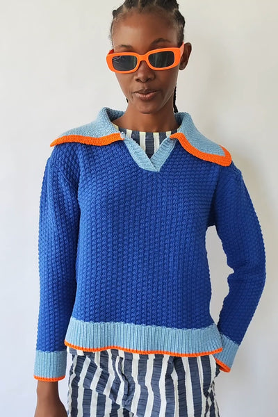 A sweater full of personality that uniquely combines textures and colors. The body in Klein blue stands out thanks to its knitted stitch, while the light blue details and the orange touch on the collar, hem, and cuffs provide contrast and a very special finish. The wide cape-style collar adds a distinctive and casual touch that elevates any look.