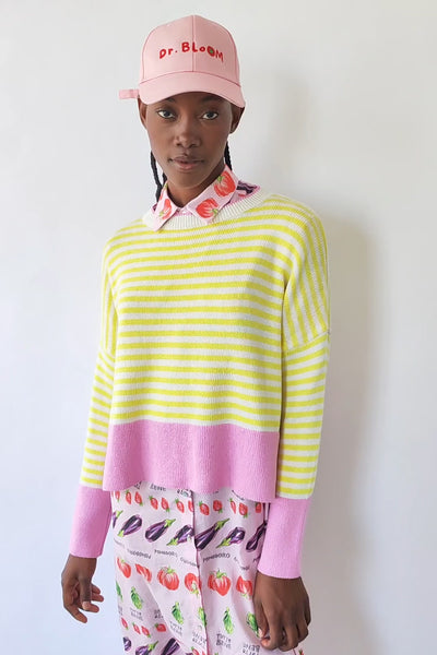 A classic renewed in Bloom style. This yellow and white striped sweater incorporates a modern touch thanks to the pink details on the hem, cuffs, and neckline trim. The result is a fresh, vibrant, and very flattering combination.