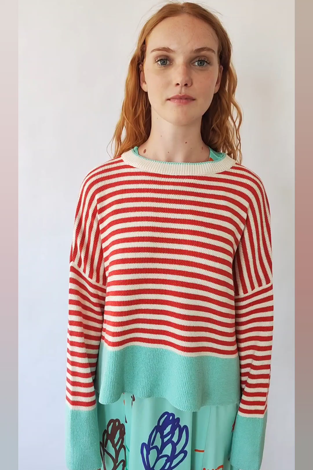 Un clásico renovado al estilo Bloom. Este jersey de rayas rojas y blancas incorpora un toque moderno gracias a los detalles en color agua presentes en el bajo, los puños y el ribete del cuello. El resultado es una combinación fresca, vibrante y muy favorecedora.