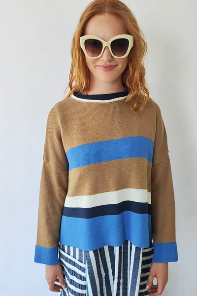 Su diseño combina tonos tierra con franjas en azul, crudo y marino, creando un contraste equilibrado y muy favorecedor. Su cuello redondo rematado en contraste aporta un toque cuidado, mientras que la silueta relajada lo convierte en una prenda cómoda para llevar todos los días. Es una prenda perfecta para acompañarte en el día a día: cómoda, combinable y con ese toque de personalidad que tanto nos gusta.