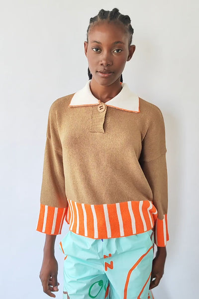 Un pull esprit rétro qui associe un corps couleur terre, avec des rayures orange et blanches sur le bas et les poignets, créant un contraste frais et plein d'énergie. Le col polo, orné d'un bouton en bois et décontracté, le rend spécial sans perdre en confort. Avec sa silhouette droite, sa chute naturelle et son tissu doux, c'est un vêtement parfait pour le quotidien : confortable, flatteur et plein de personnalité.