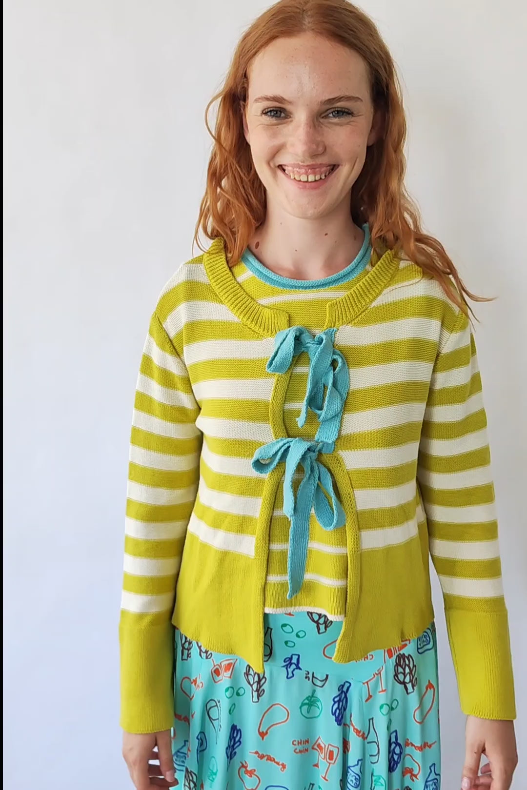 Eine Strickjacke, die Romantik und Farbe auf die typisch Bloom'sche Weise vereint. Das gestreifte Design in Gelb und Naturweiß verleiht eine frische Note, während die vorderen Schleifen in lebhaftem Aquagrün einen bloom-typischen, persönlichen Akzent setzen.