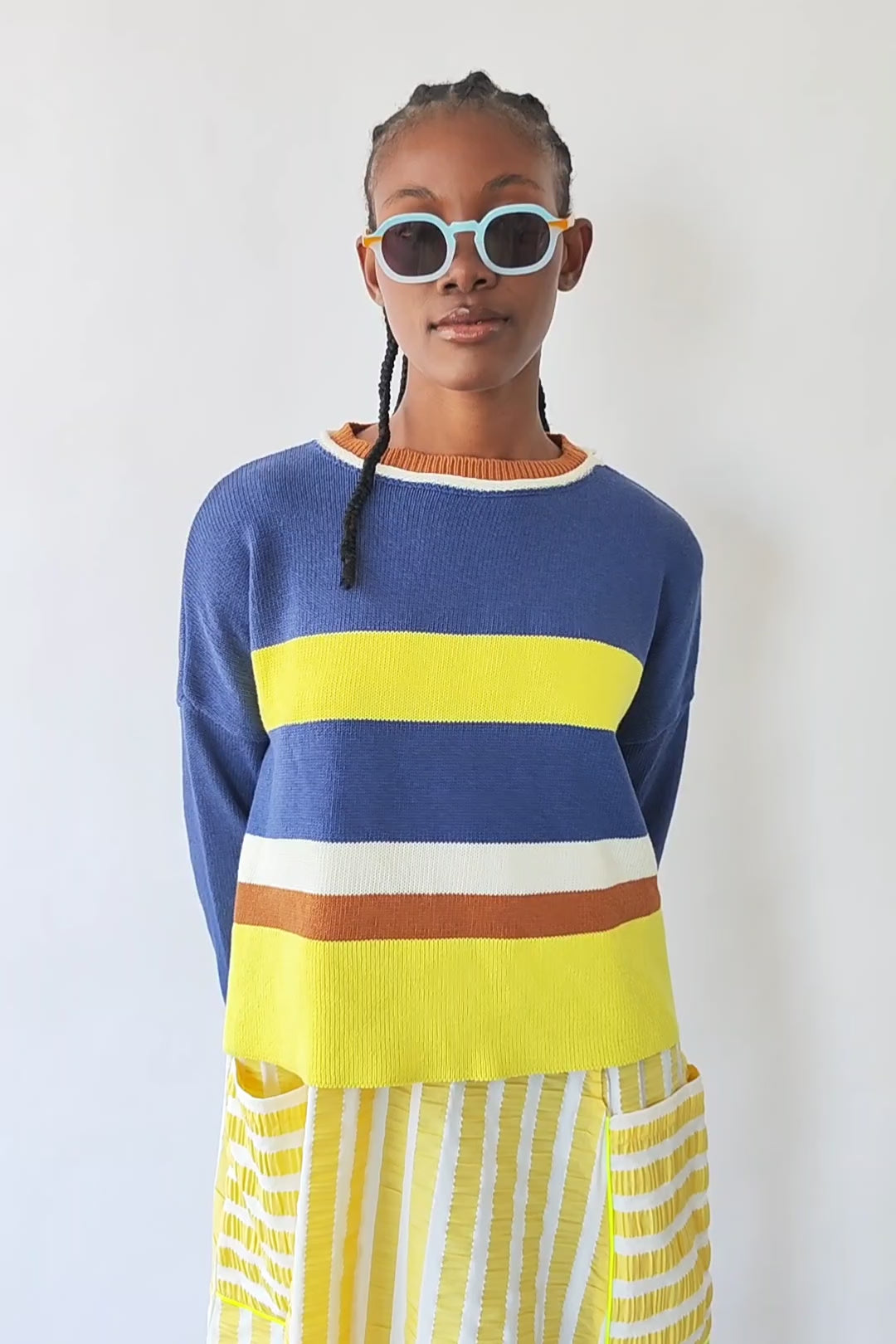 Sein Design kombiniert Blautöne mit Streifen in Gelb, Weiß und Camel, was einen ausgewogenen und sehr schmeichelhaften Kontrast schafft. Der Rundhalsausschnitt mit kontrastierendem Abschluss verleiht einen gepflegten Touch, während die lockere Silhouette das Kleidungsstück bequem für den Alltag macht. Es ist ein perfektes Kleidungsstück für den Alltag: bequem, vielseitig kombinierbar und mit diesem persönlichen Touch, den wir so sehr mögen.